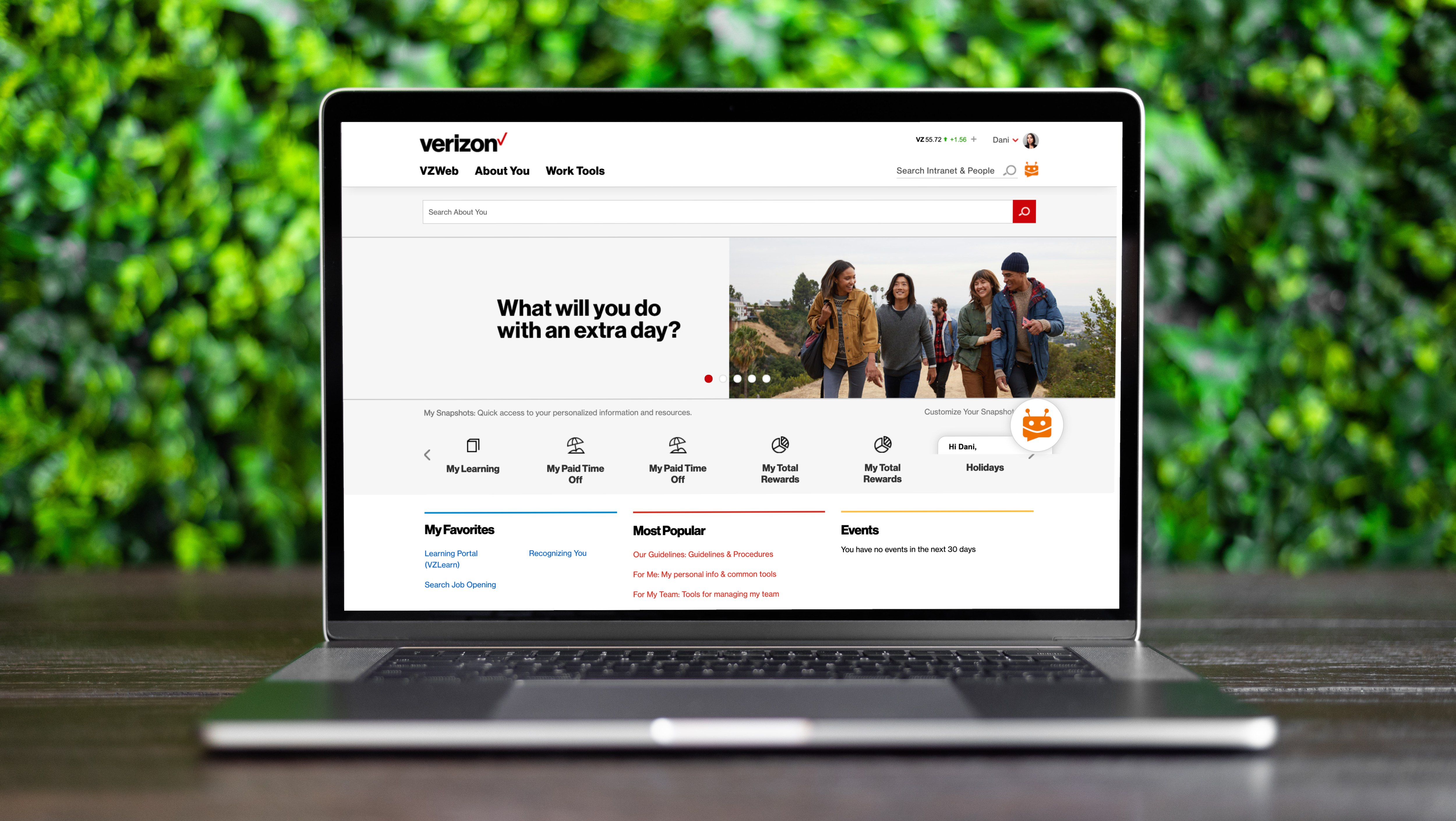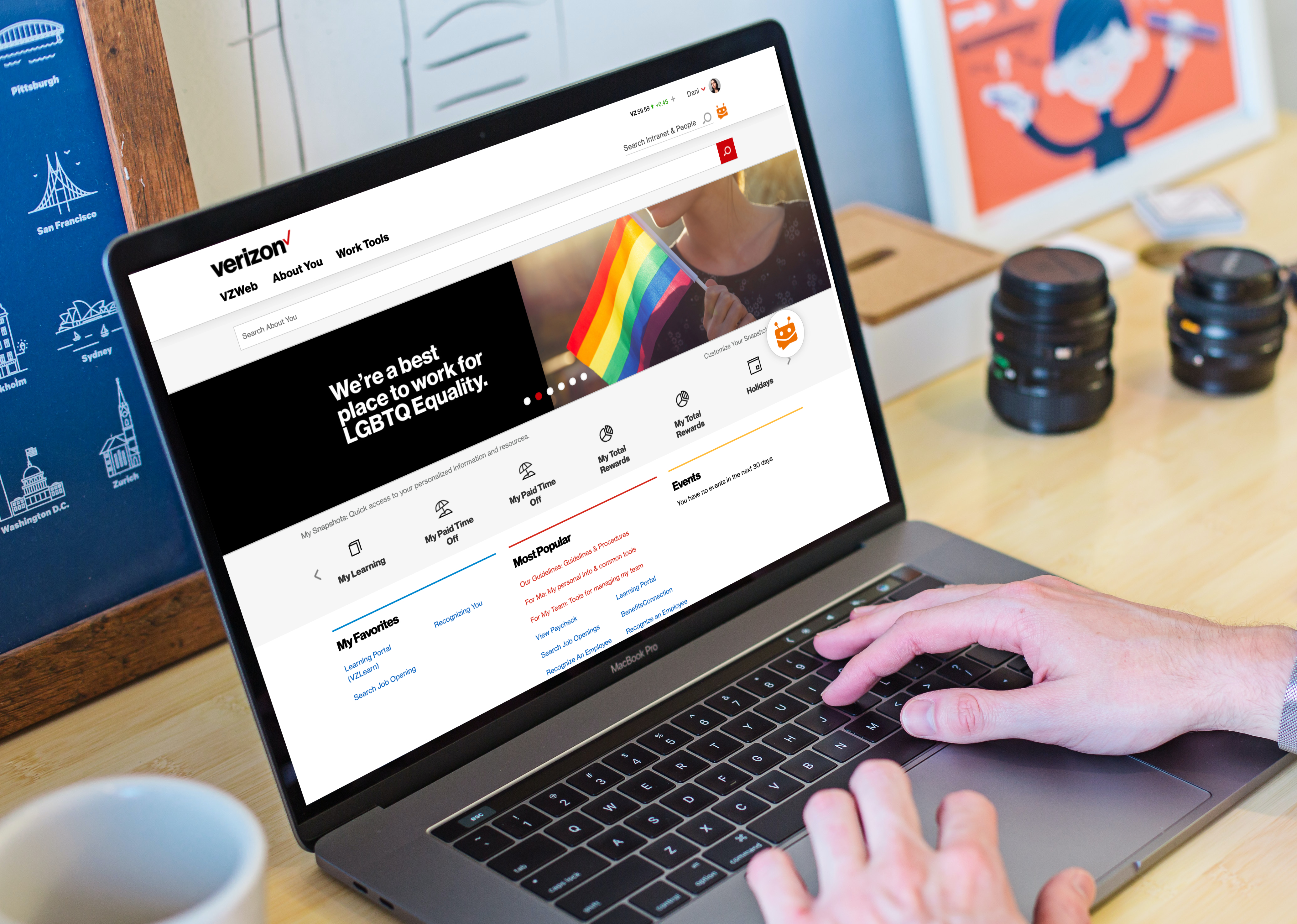 VZWeb is the central Verizon corporate intranet resource portal that hosts resources for employees. The rotating banners promote articles written by Corporate and Employee Communications, as well as Human Resources Communications. This shared digital space hosts banners on a coordinated schedule based on the current communication strategy timeline. Human Resources Communications utilizes this space for greater visibility for their own editorial team's content.
